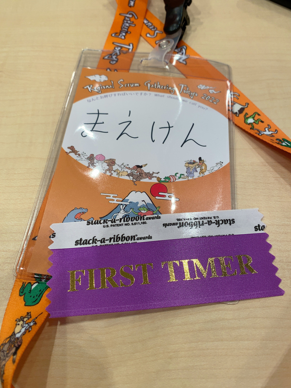 最初に渡される名札。その下に「CSM(認定スクラムマスター)」とか「SPONSOR」とか書かれている札をつけて、どんな人なのか分かるようになってました。自分は初回なのでFIRST TIMERをつけてました。